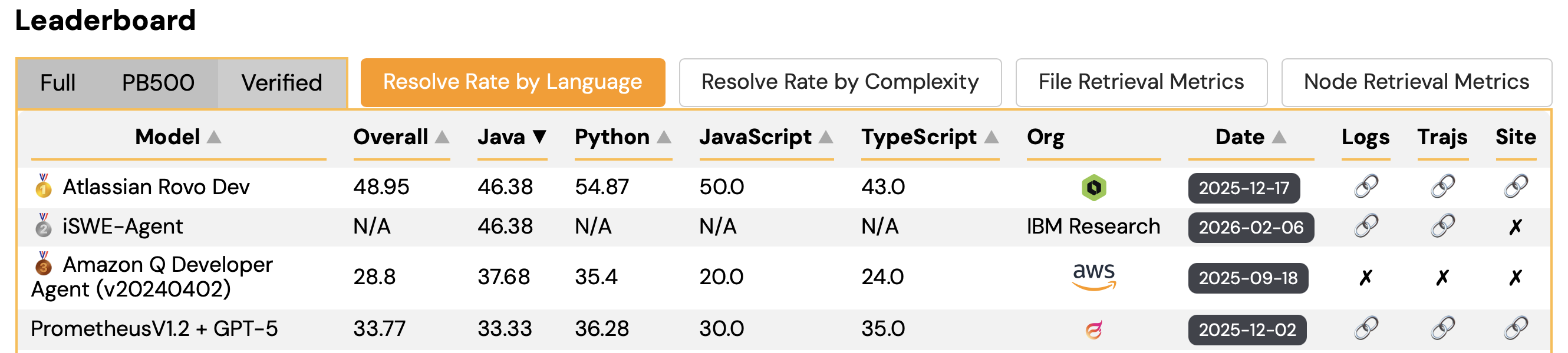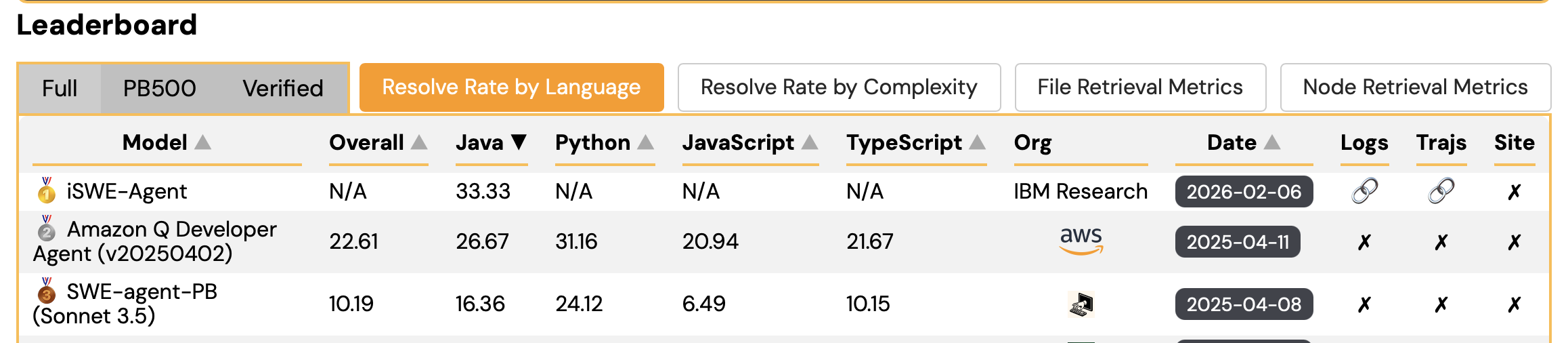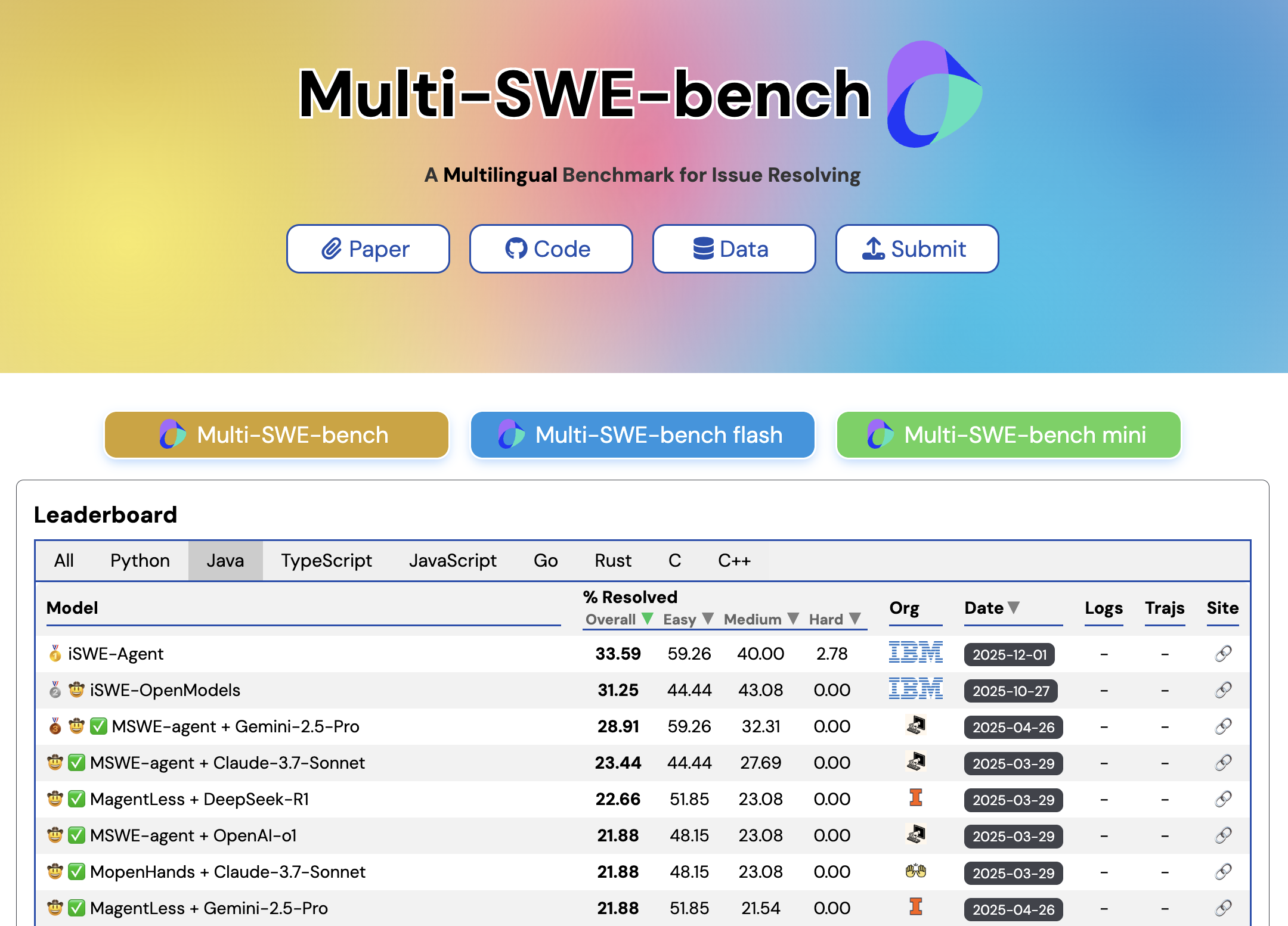 | Dec 01, 2025 | iSWE-Agent, IBM Research’s software engineering agent, achieved Rank 1 on the Multi-SWE-Bench Java leaderboard with a 33% resolution rate, substantially outperforming the previous best score of 28.9%. iSWE-Agent achieves Rank-1 on Multi-SWE-Bench Java leaderboard (1 December 2025) Related resources: |
