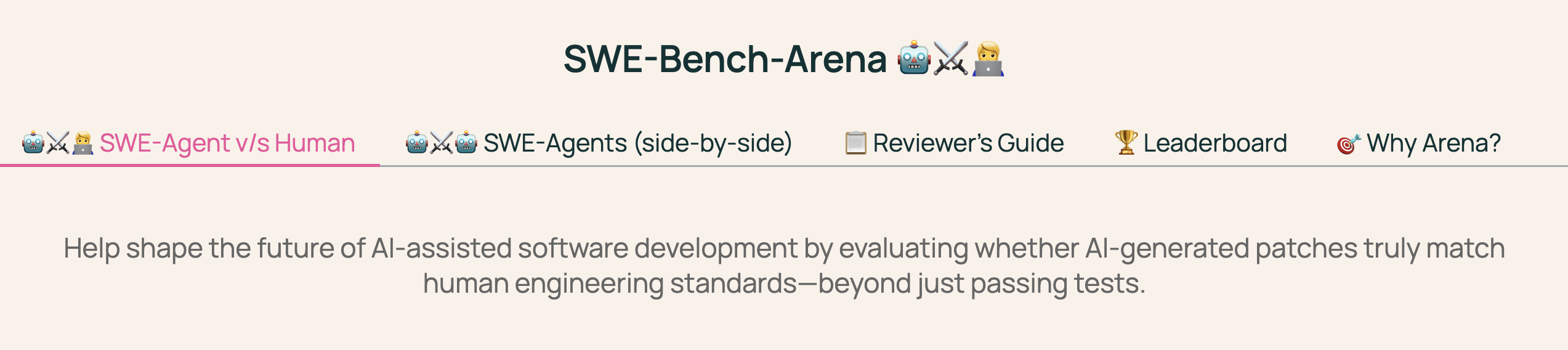 | Sep 03, 2025 | SWE-Bench-Arena, a platform for blind evaluation of AI-generated code patches, is now live. Unlike benchmarks that only measure test-pass rates, SWE-Bench-Arena evaluates patches across five production-relevant dimensions: correctness, maintainability, readability, performance, and simplicity. SWE-Bench-Arena — blind evaluation of AI-generated code patches Related resources: |